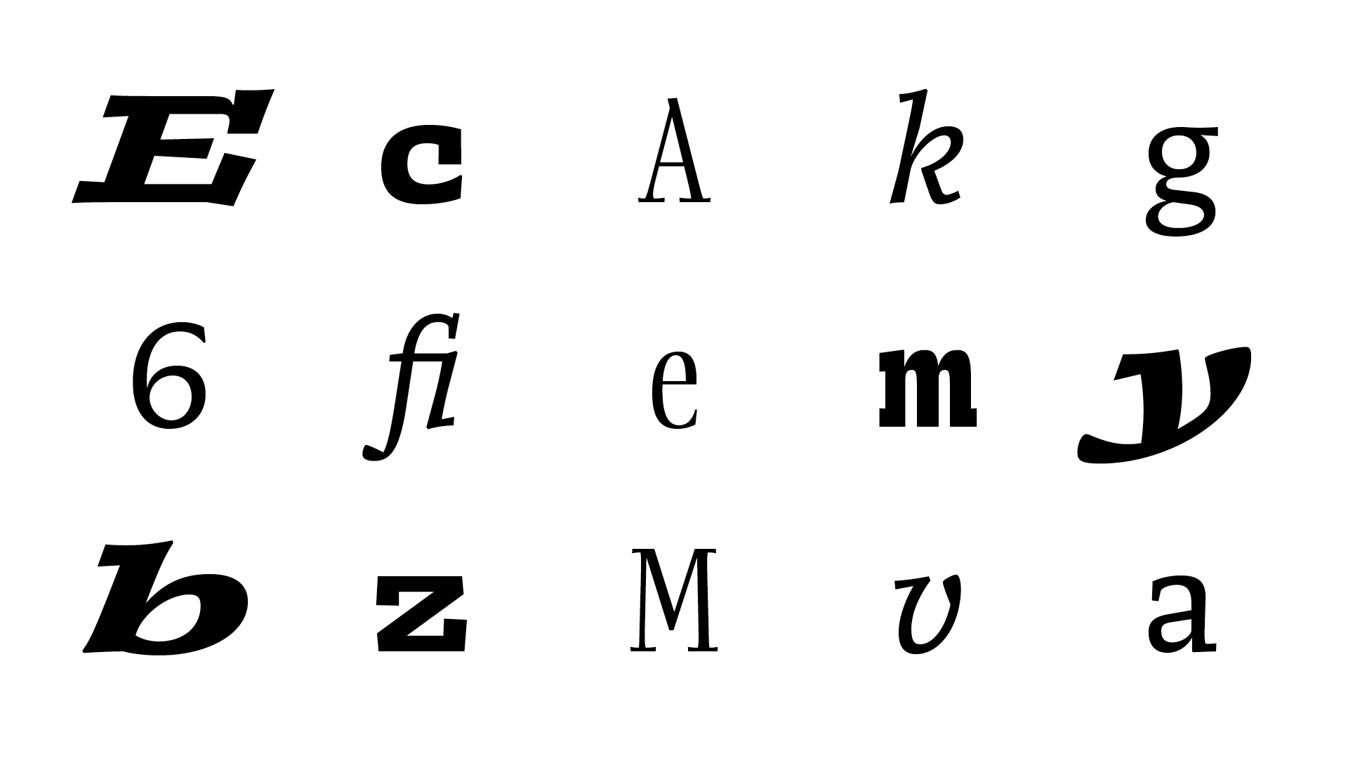 The italic styles worked better in the extended widths, with more space for the heavy asymmetrical serifs. The upright styles, on the other hand, fit better the condensed side of the design space; forming tight blocky headlines so characteristic to magazines. Since I wanted to explore different voices for the display styles, I separated them instead of looking for a middle ground. The result was a dynamic italic and a more balanced roman; each one occupying its own space.